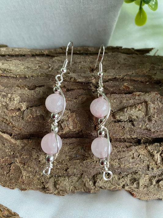 Rose Quartz Gemstone Silver Wrapped Crystal Earrings, Unique Handmade Earrings,