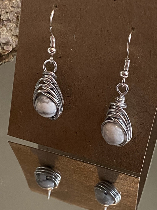 Howlite Gemstone and Silver Herringbone Wrapped Crystal Earrings, Unique Handmade Gift,
